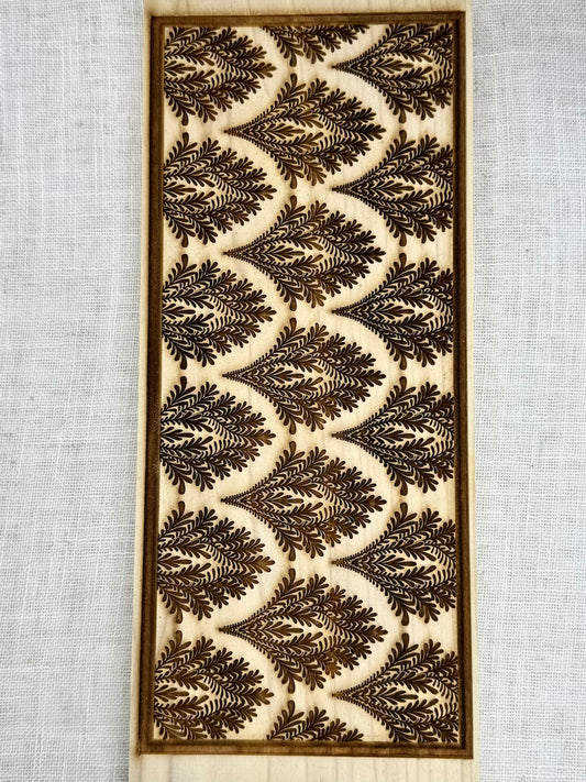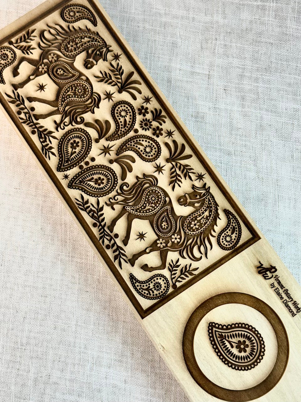 This site highlights a gallery of Elaine's ceramic work and features textured rolling pins, stamps & templates for sale. Our food safe rolling pins are crafted from superior hardwoods harvested in northeastern USA. They are solidly constructed with a steel rod and bushings that attach the handles for a lifelong smooth rotation. These rolling pins are intricately detailed with deep engravings for the best impression on the market. A true heirloom piece of art in itself to be passed on from generation to generation, for you to bake with or make ceramic art that will last for centuries! All the rolling pins are exclusively designed by Elaine Diamond and engraved in her workshop in Vermont.