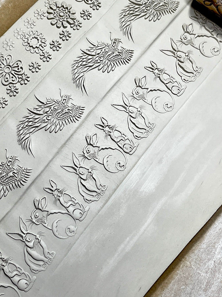 One of our most beloved designs now in 2" textured rolling pin form. The 2" "Bunnies" textured roller will not disappoint! As the name suggests, this roller features the sweet and gentle bunny rabbit in various positions. Perfect for Spring, Holiday time or the animal lover- this roller is both a classic and timeless necessity for anyone's collection!