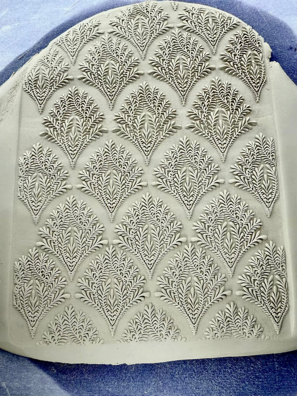 Bring timeless glamour to your art with this stunning engraved "Art Deco Fan Design", inspired by the bold elegance of the 1920s. Featuring graceful, fanned shapes accented with delicate, feathery details, this pattern blends strong geometric structure with soft, flowing movement. The engraving creates crisp, refined impressions that highlight every fan and feathered line. Perfect for Art Deco–inspired pottery, vintage-style décor, statement serving pieces or wedding details- this design adds a touch of old-world "Gatsby" luxury to modern making. Whatever you’re shaping- rest assured, the feathered fan pattern brings the all the drama & rhythm to every classic piece.