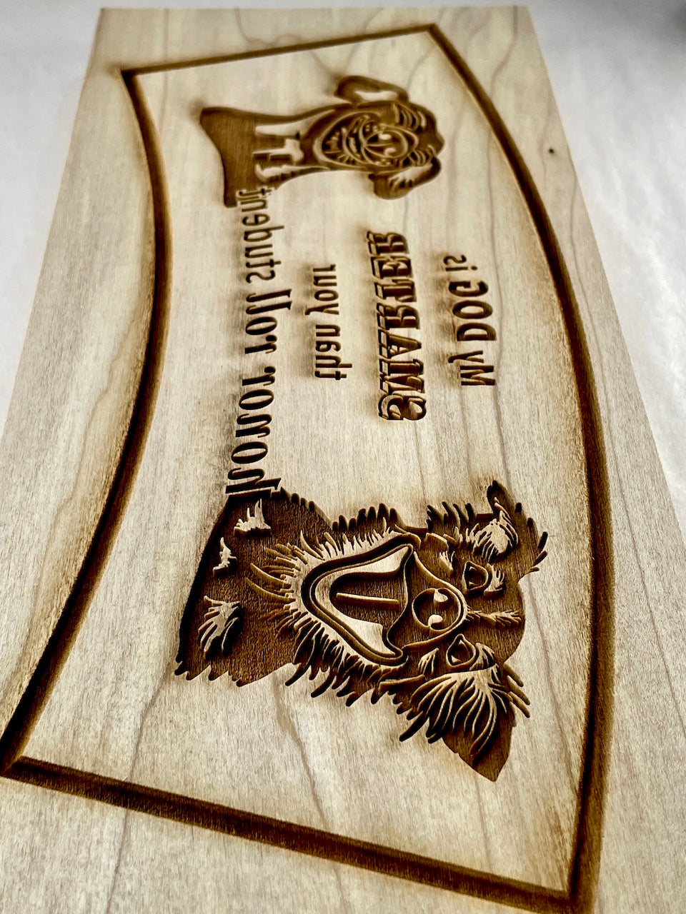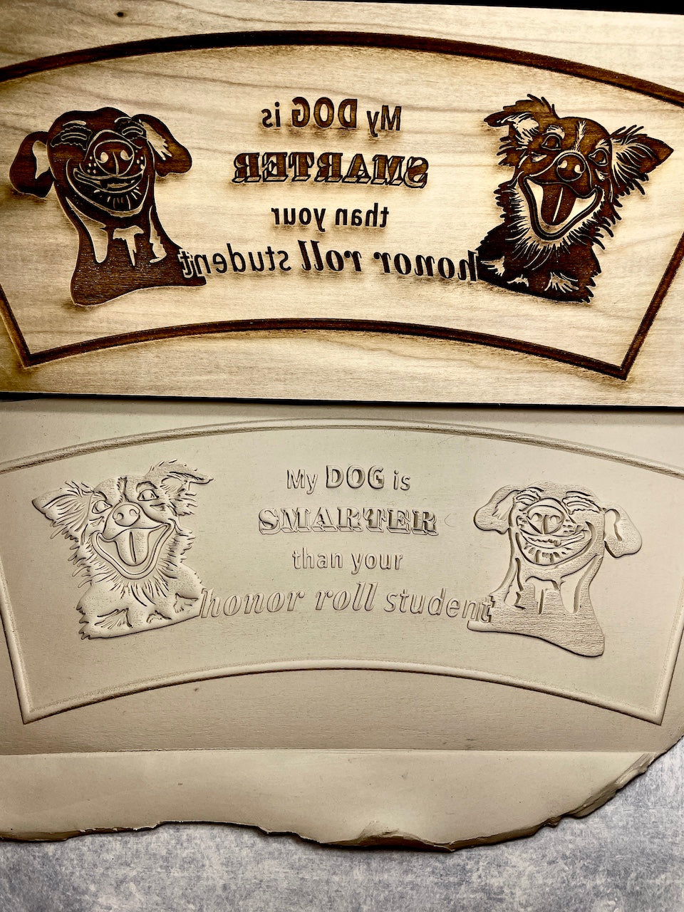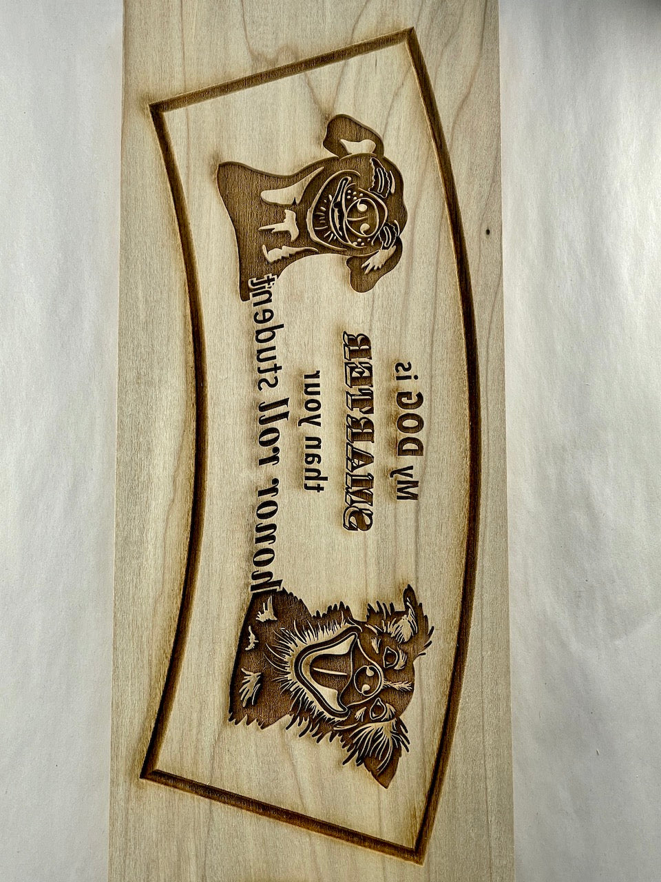 This hilarious curved mug plank is sure to please all the dog lovers out there! A funny spoof on the popular bumper sticker, what's better than waking up to a nice cup of coffee and a smile?! Detailed with two dogs on either side, the center caption on this mug plank reads: "My DOG is SMARTER than your honor roll student". A fun, silly, curved plank perfect for anyone with a sense of humor!