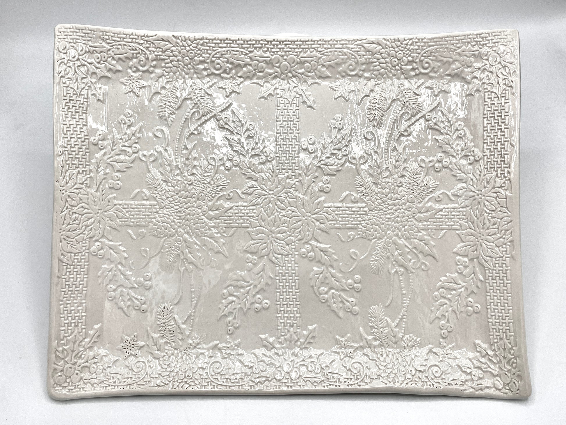 Platter made with the Elegant Holiday Textured rolling pin, simply glazed in white