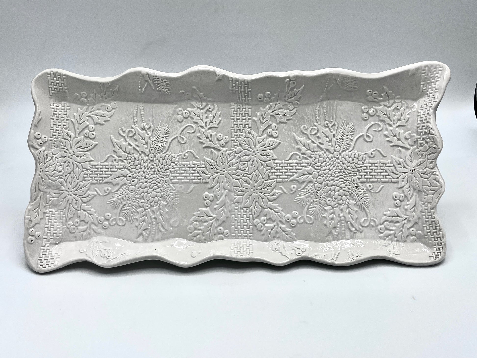 White glazed tray made with the Elegant Holiday Textured rolling pin