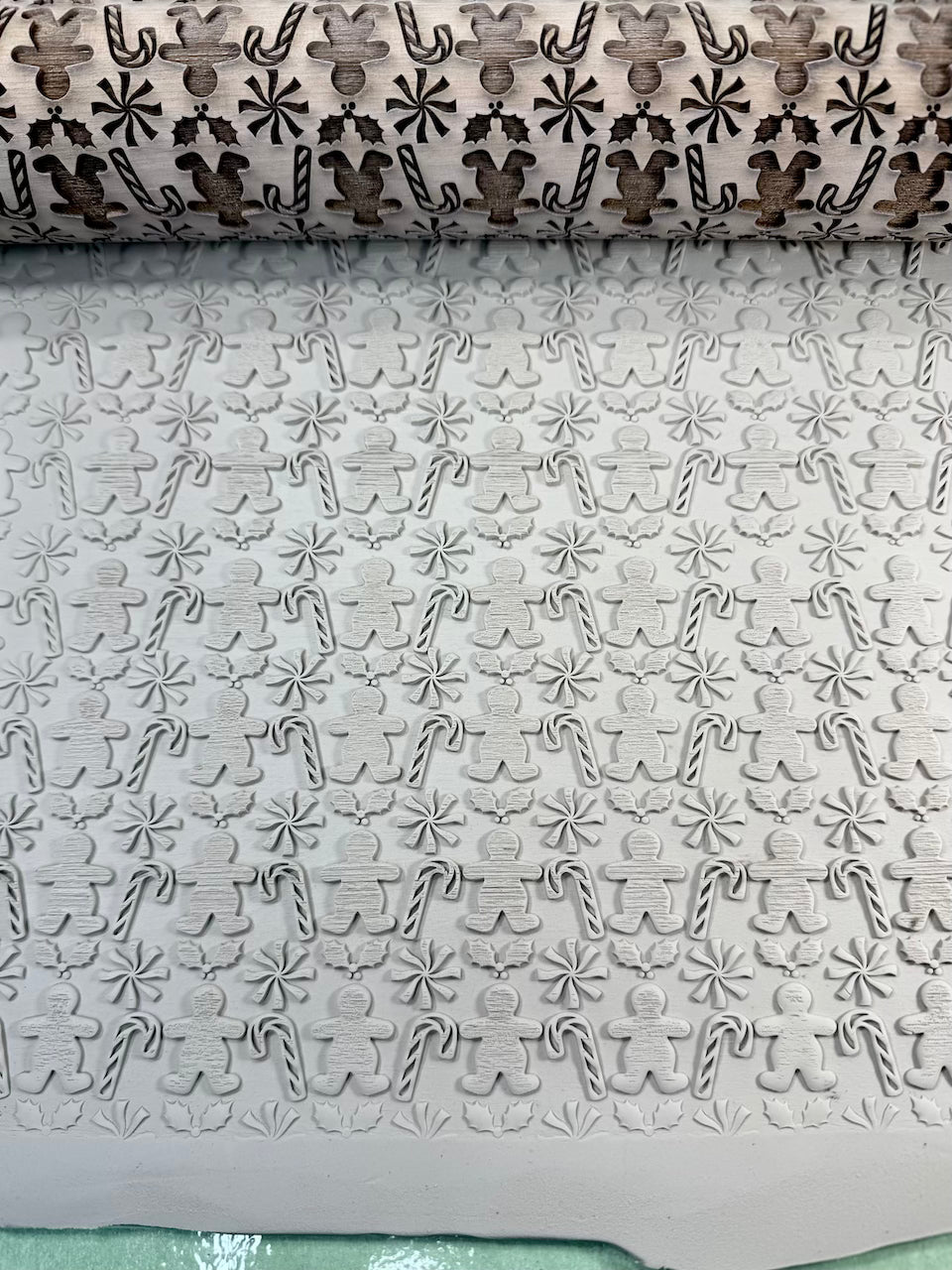 Add a touch of holiday cheer to your creations with the charming "Gingerbread Men & Candy Canes" design. Featuring a repeating pattern of gingerbread cookies, swirling candy canes and festive accents of holly & peppermint candies, this design instantly brings the joy of the season to your pottery, clay, or baking projects! This combination of classic gingerbread and candy adds nostalgic holiday charm to your design, making it a favorite for both professional makers and home crafters. Whether you’re creating scrumptious kitchen delights or unique textured pottery, this engraved design brings festive fun to every roll!