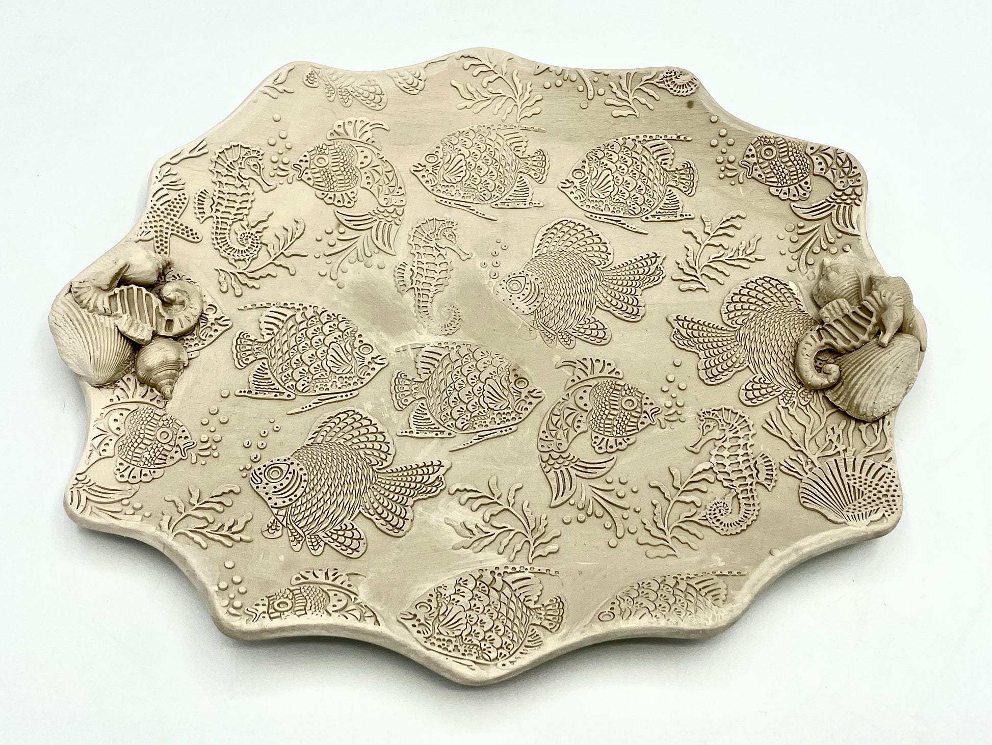 Textured platter using the Under the Sea rolling pin, enhanced with sprig molds (greenware)